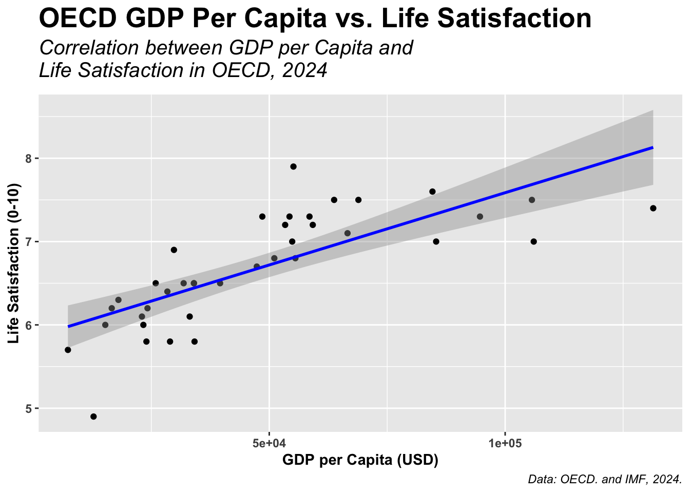This scatter plot shows that the OECD GDP per capita and Life Satisfaction levels correlate positively, as shown by the positive trend line. If you do not know, the “5e+04”, the E+n symbol, represents the preceding number (5) of E+, multiplied by 10 to the nth power.
