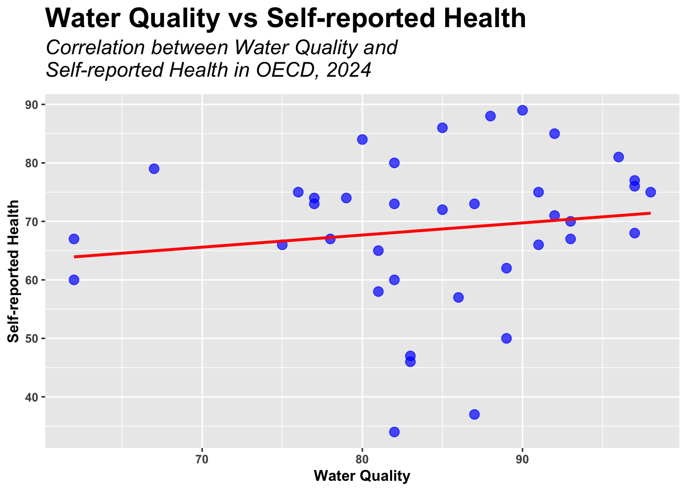 Unlike Graph 2, the Water Quality had little to no correlation with Self-reported Health in OECD nations. It is assumed in more advanced nations such as the OECD members, proper health care is far more important than water infrastructure. Furthermore, the Water Quality level is considered good on the average level in the OECD, which is also a factor that demonstrates the low relativity to Self-reported Health.